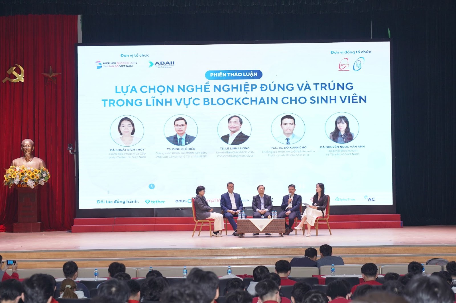 (Từ trái qua) Bà Khuất Bích Thủy (Tether), TS. Đinh Chí Hiếu (PTIT), TS. Lê Linh Lương (Viện ABAII), TS. Đỗ Xuân Chợ (PTIT), và bà Nguyễn Ngọc Vân Anh (VBA) cùng tham gia thảo luận về những cơ hội nghề nghiệp và lộ trình để sinh viên tham gia lĩnh vực blockchain một cách bài bản.