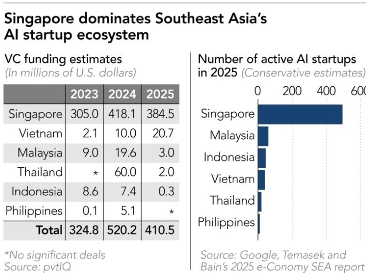 Sự thận trọng của các nhà đầu tư không phải là không có cơ sở. Theo ước tính từ pvtIQ, nền tảng thị trường tư nhân thuộc Smartkarma, dòng vốn đầu tư mạo hiểm đổ vào các startup AI tại Đông Nam Á trong năm 2025 đã sụt giảm khoảng 20% so với cùng kỳ năm trước, đạt mức 410,5 triệu USD.