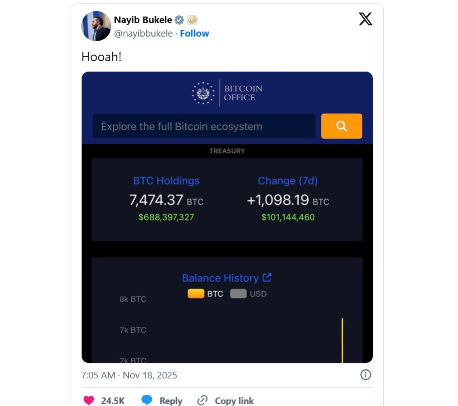 Tổng thống Nayib Bukele trực tiếp công bố các thương vụ này trên mạng xã hội, ăn mừng cột mốc mới trong chính sách tiền số của đất nước. Với 7.474 BTC trong “kho bạc số”, El Salvador củng cố vị thế quốc gia tiên phong trong làn sóng chấp nhận Bitcoin ở cấp thể chế.