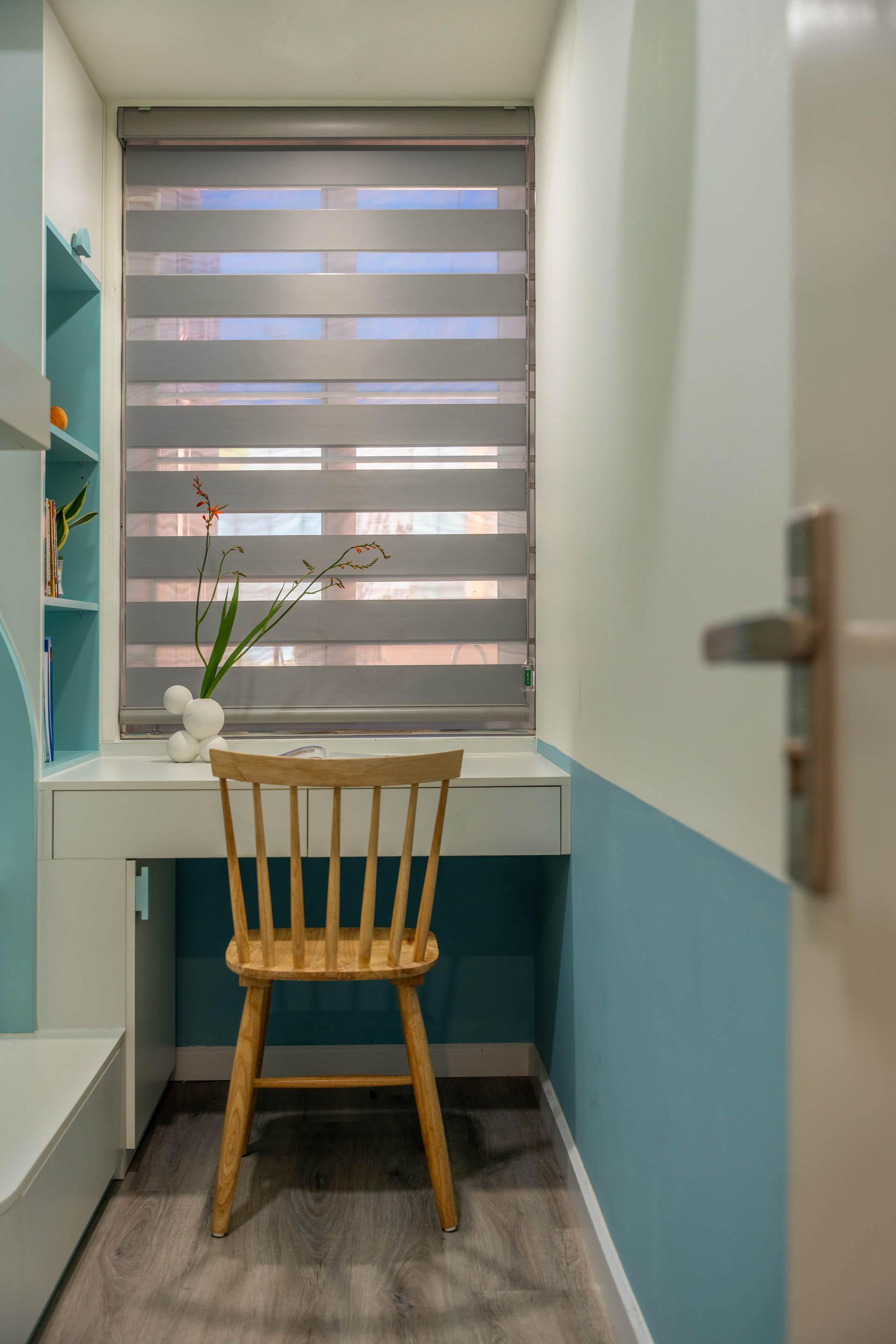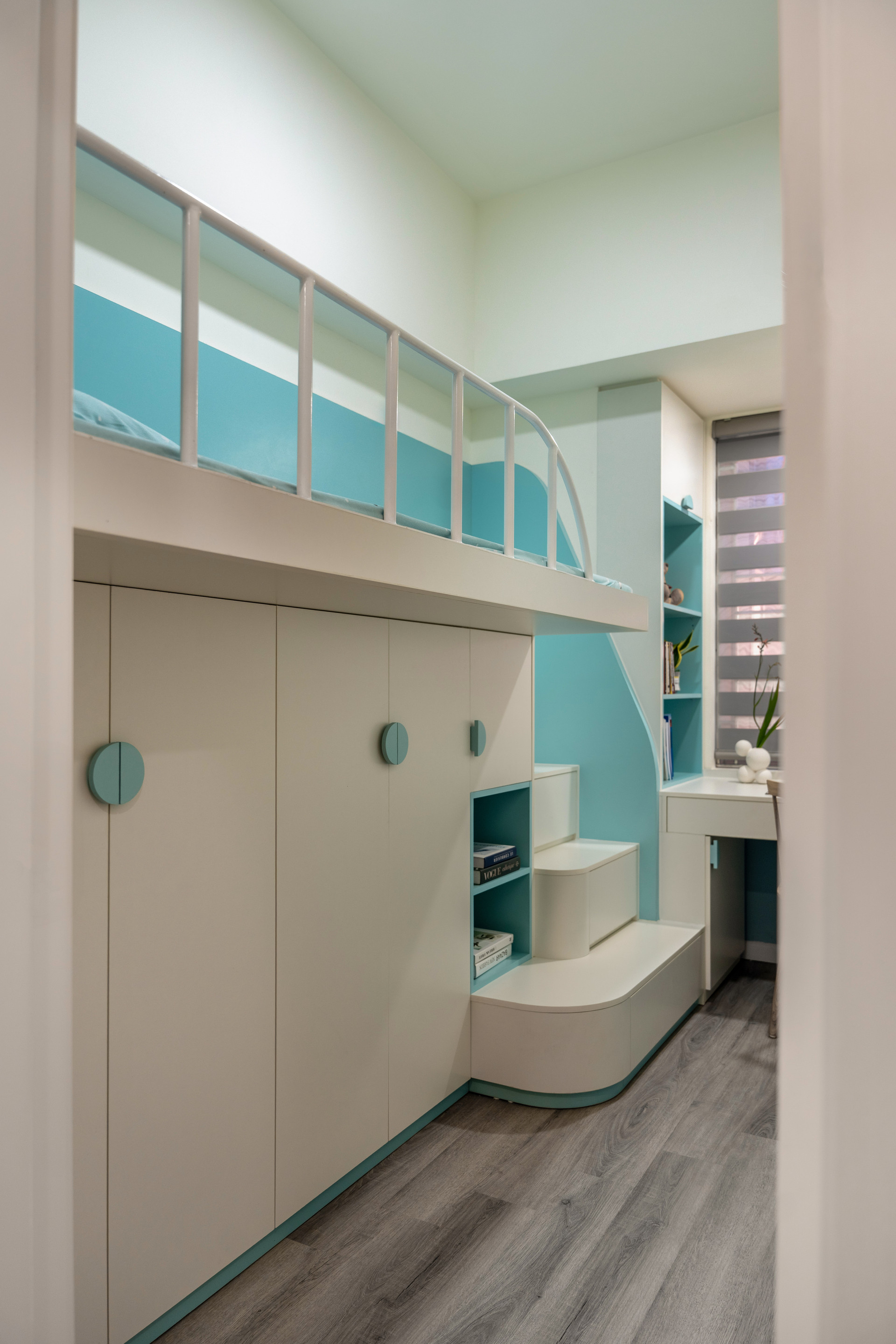 Một phòng ngủ được chia đôi thành 2 phòng ngủ nhỏ cho 2 bé. Phòng bé gái sử dụng bảng màu pastel, tích hợp giường, bàn học và kệ sách