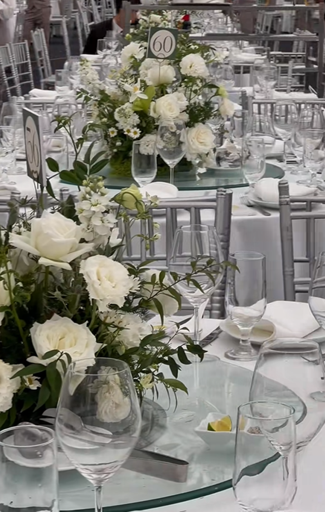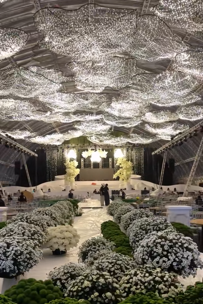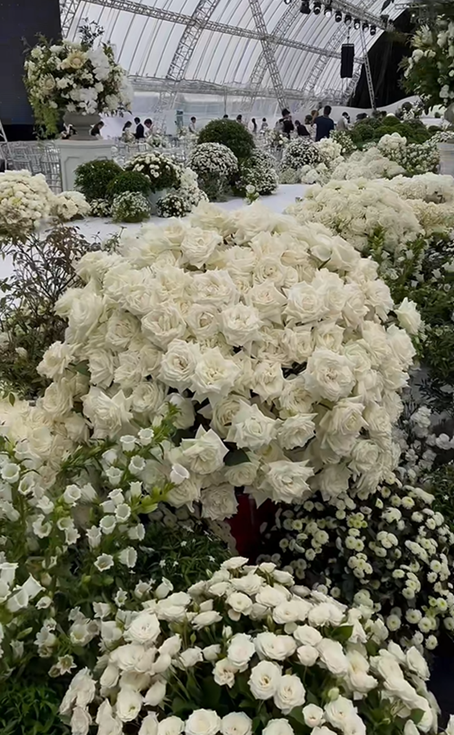 Toàn bộ khu vực được trang hoàng bởi hàng nghìn bông hoa trắng - từ hoa hồng, hoa lan, hoa baby đến những bụi cẩm tú cầu và hoa mây - sắp xếp thành những "núi hoa" khổng lồ. Lối đi dẫn vào tiệc là một "đường hầm hoa" dài, hai bên là hàng cây xanh xen lẫn bụi hoa trắng, dẫn khách mời đến khu vực chính nơi có sân khấu biểu diễn và khu vực chụp ảnh.