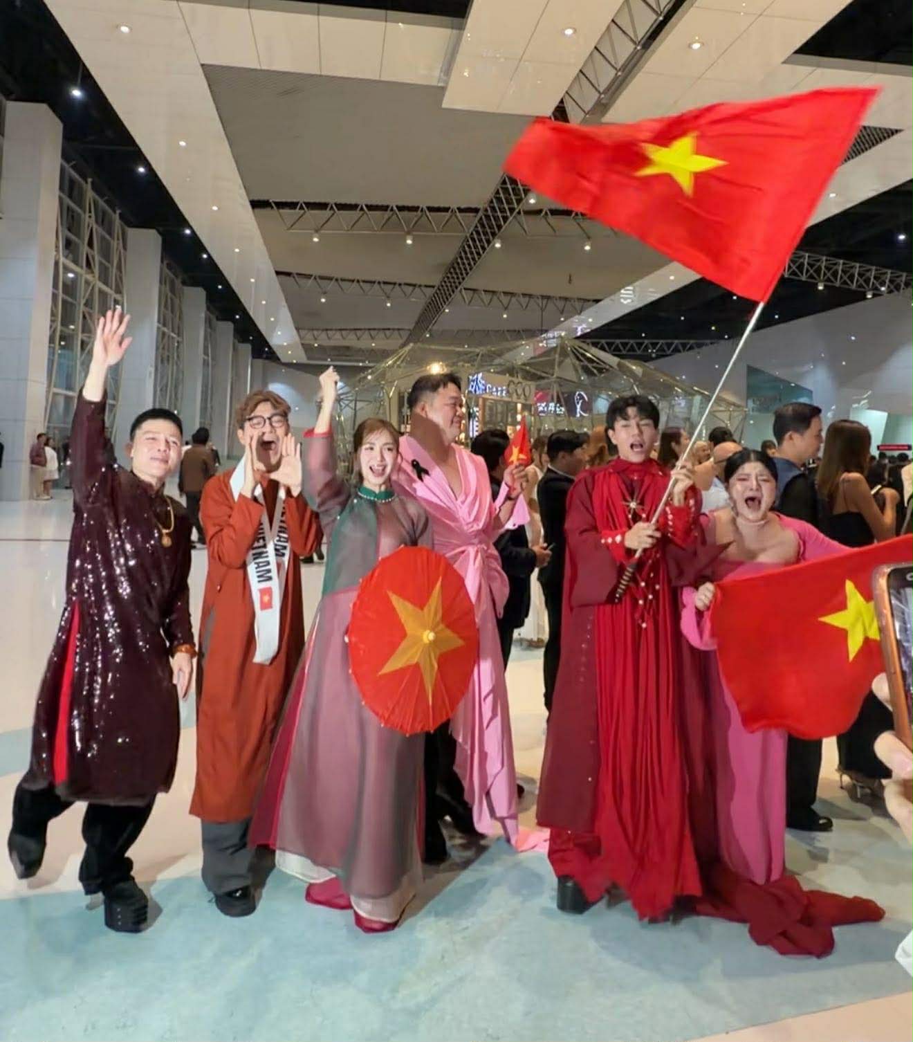 Long Chun và Viên Vibi hội ngộ Việt Phương Thoa tại Thái Lan, mang theo poster cỡ lớn, mặc áo dài và quàng khăn rằn. Bộ ba muốn quảng bá văn hóa Việt Nam đến bạn bè quốc tế trong lúc cổ vũ Hương Giang.