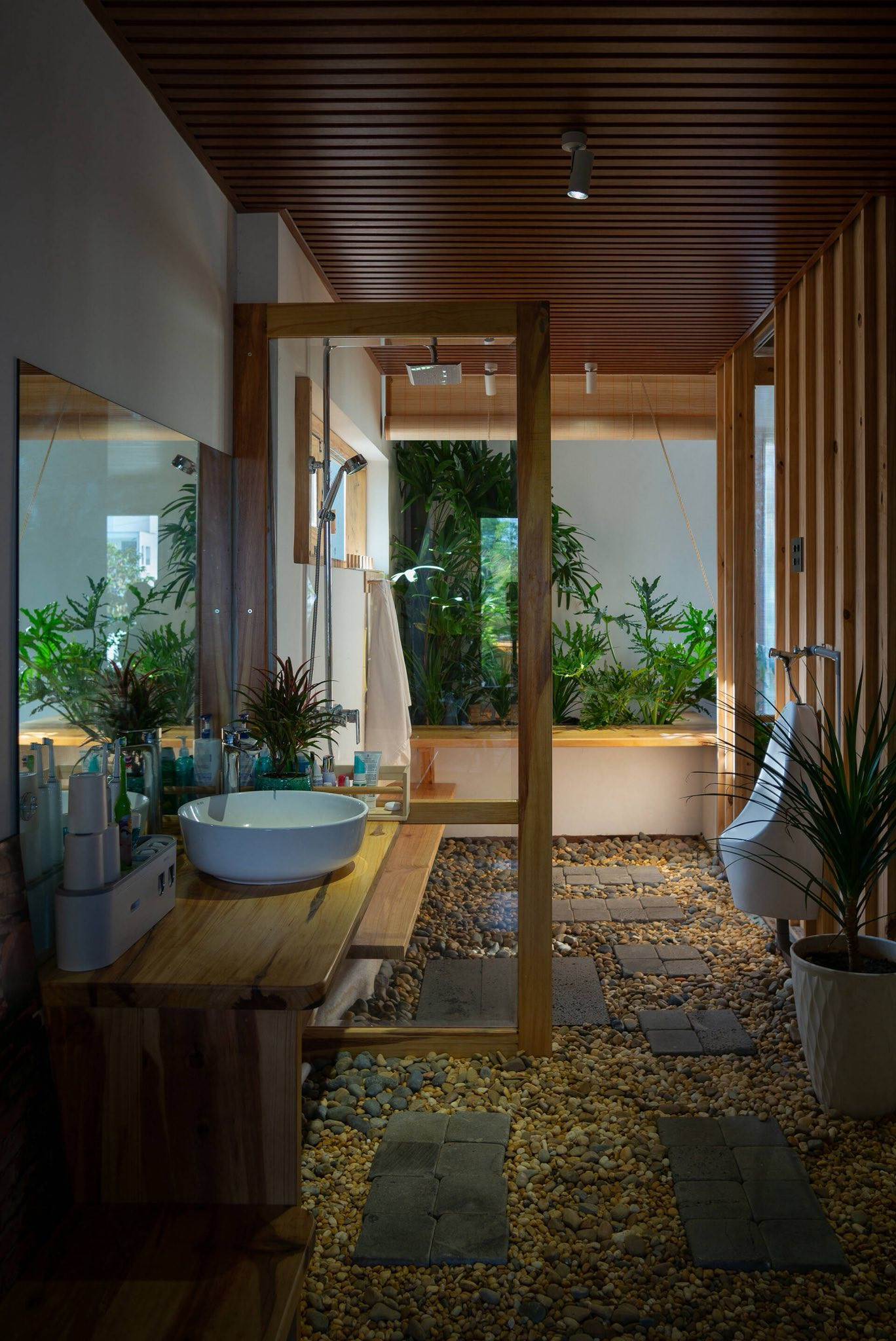 Phòng tắm cũng được bố trí theo hướng mở để ánh sáng tự nhiên len lỏi vào từng góc, mang lại cảm giác thư thái và gần gũi với thiên nhiên.