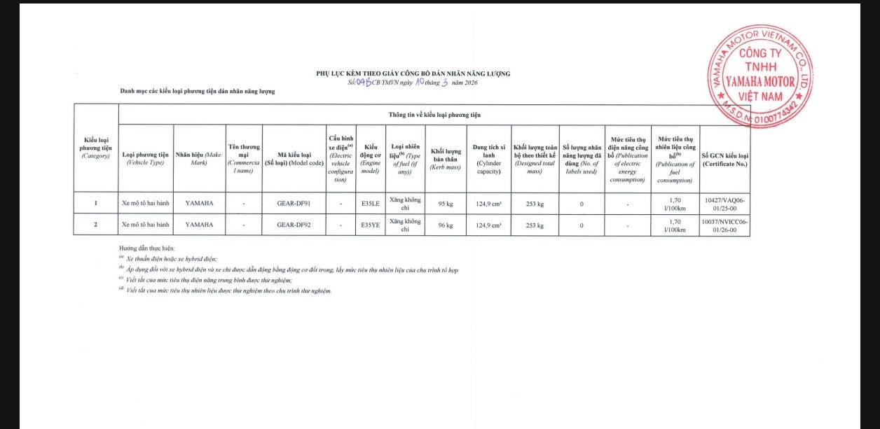 Thông tin nhãn năng lượng của mẫu xe Yamaha Gear tại Việt Nam. Ảnh: Sưu tầm