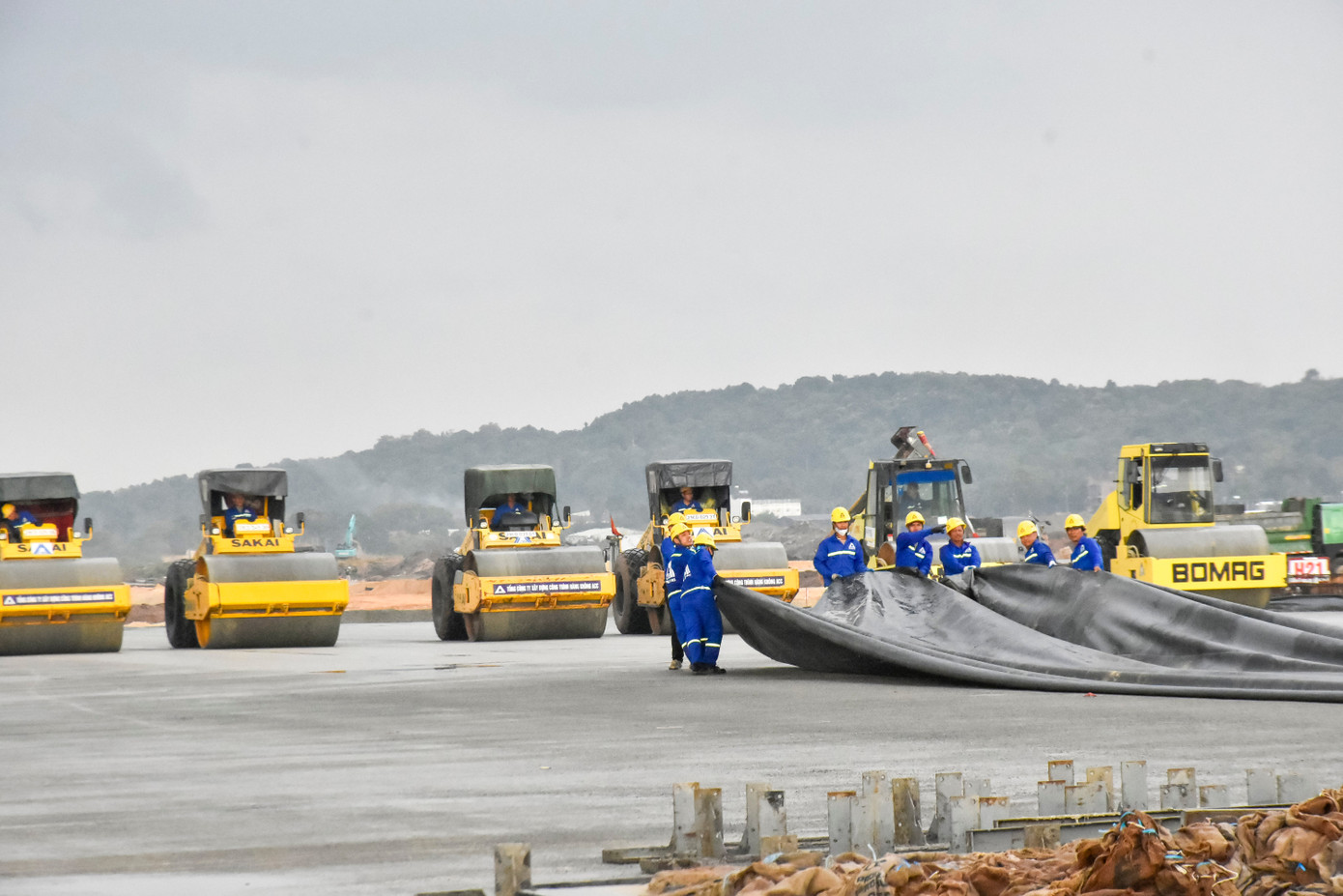 Tại Dự án mở rộng Cảng hàng không quốc tế Phú Quốc, các hạng mục được triển khai đồng bộ trên diện tích hơn 1.000ha (tổng vốn đầu tư khoảng 22.000 tỷ đồng) . Nhà ga T2 đã hoàn thành phần xây dựng cơ bản; nhà ga VIP đang hoàn thiện, hạng mục đường cất hạ cánh được đẩy nhanh tiến độ. Khi hoàn thành, sân bay Phú Quốc sẽ đạt công suất 18 - 20 triệu hành khách mỗi năm. Trong ảnh, các nhà thầu huy động hàng trăm công nhân cùng máy móc, thiết bị thi công ngày đêm trên đường cất hạ cánh số 2.