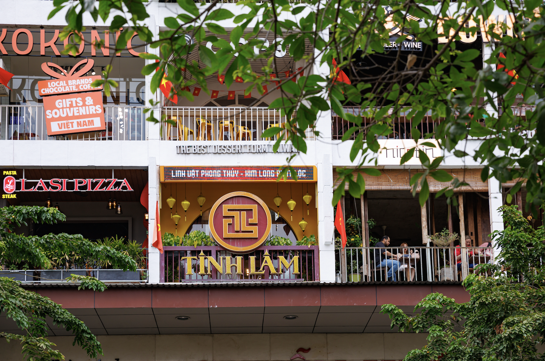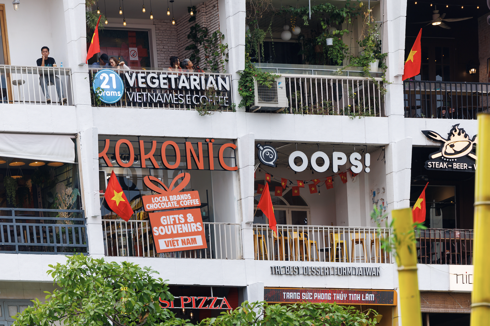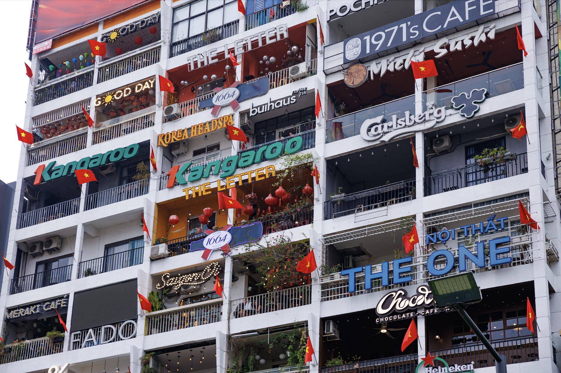 Toàn bộ toà chung cư được sơn trắng khiến cho các hàng quán càng nổi bật với màu sắc riêng