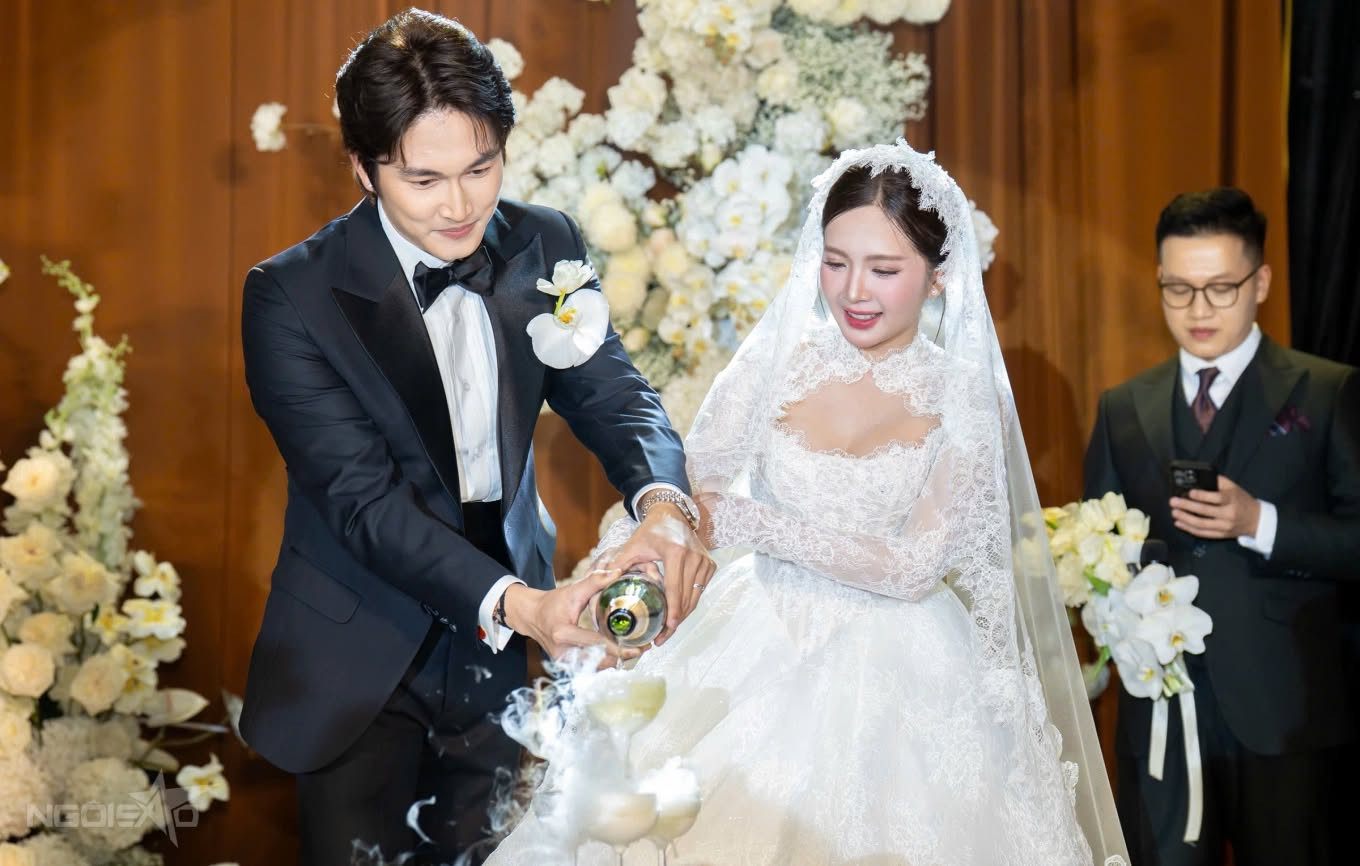 Nữ diễn viên khiến khách mời ngỡ ngàng vì phong cách trang điểm và làm tóc đơn giản nhưng vô cùng cuốn hút. Trong khi đó, chú rể Đình Tú chọn vest tuxedo đen lịch lãm. Hai diễn viên được khen vô cùng đẹp đôi với một đám cưới như cổ tích ở đời thường.