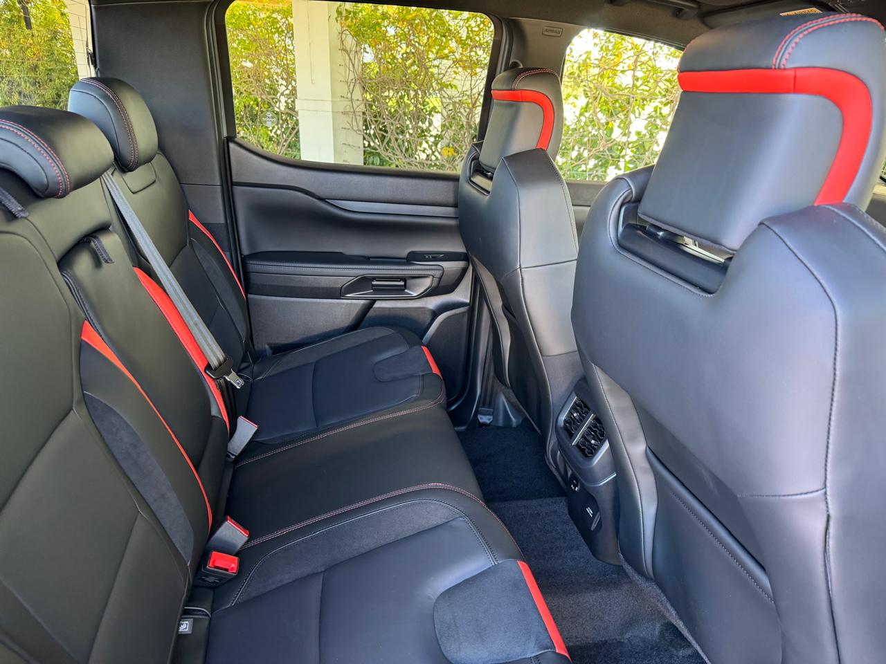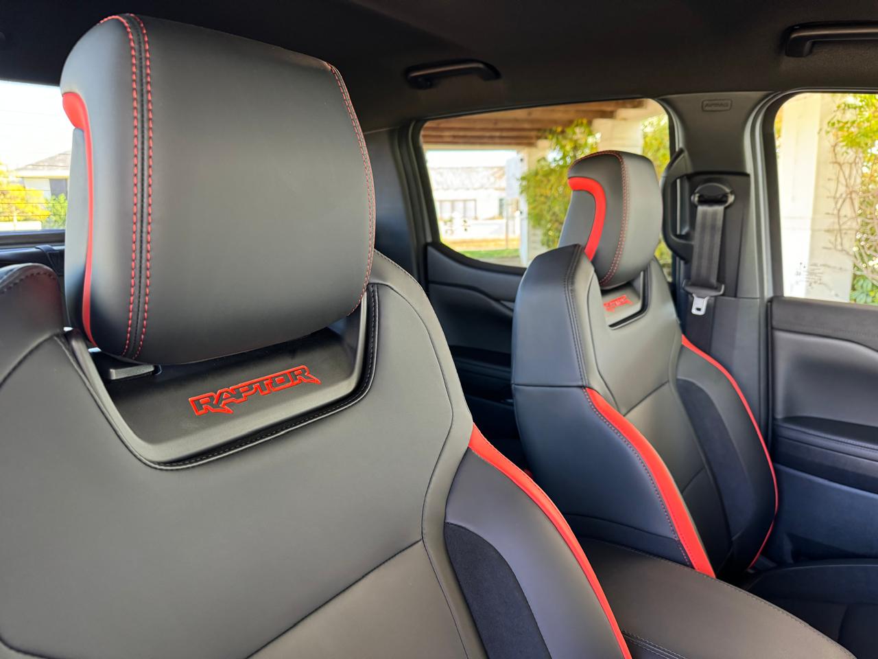 Bên trong nội thất, Ford Ranger Raptor V6 vẫn được trang bị giống bản máy dầu 2.0L như cặp ghế thể thao, chỉ khâu đỏ tương phản, vô lăng bọc da tích hợp tính năng sưởi cùng lẫy chuyển số phía sau, đèn nền nội thất, bảng đồng hồ kỹ thuật số 12,4 inch kết hợp màn trung tâm 12 inch và dàn 10 loa Bang & Olufsen bên trong.