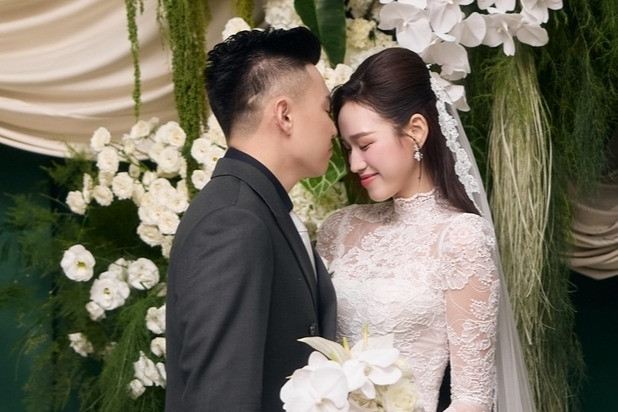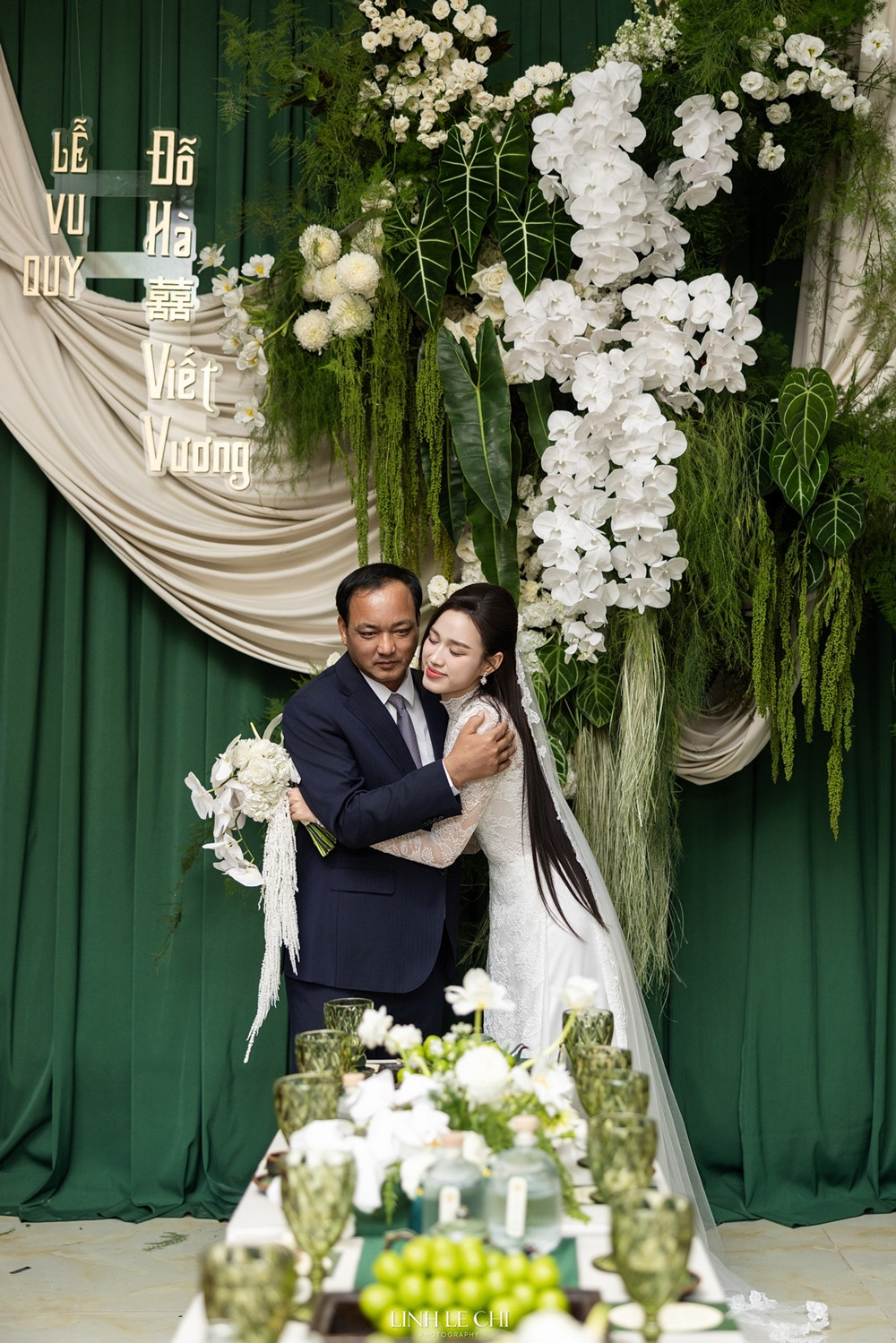Chú rể Nguyễn Viết Vương thể hiện sự quan tâm tế nhị đến tâm trạng của vợ. Chú rể luôn đứng bên cạnh, nắm tay Đỗ Thị Hà, dành những cử chỉ âu yếm để an ủi cô dâu. Hình ảnh chú rể cúi đầu chào bố mẹ vợ, thể hiện sự tôn trọng các nghi lễ truyền thống.