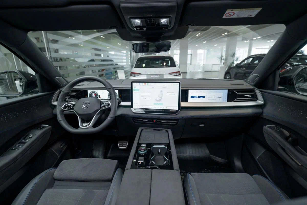 Khoang nội thất của xe nổi bật với cụm đồng hồ kỹ thuật số, hệ thống thông tin giải trí đặt nổi và màn hình hiển thị dành cho hành khách phía trước. Đặc biệt, xe còn có thể được trang bị thêm ba màn hình khác, cho thấy Teramont Pro sẽ có hệ thống giải trí cho hàng ghế sau. Như vậy, tùy chọn cao cấp nhất lên tới 6 màn hình.