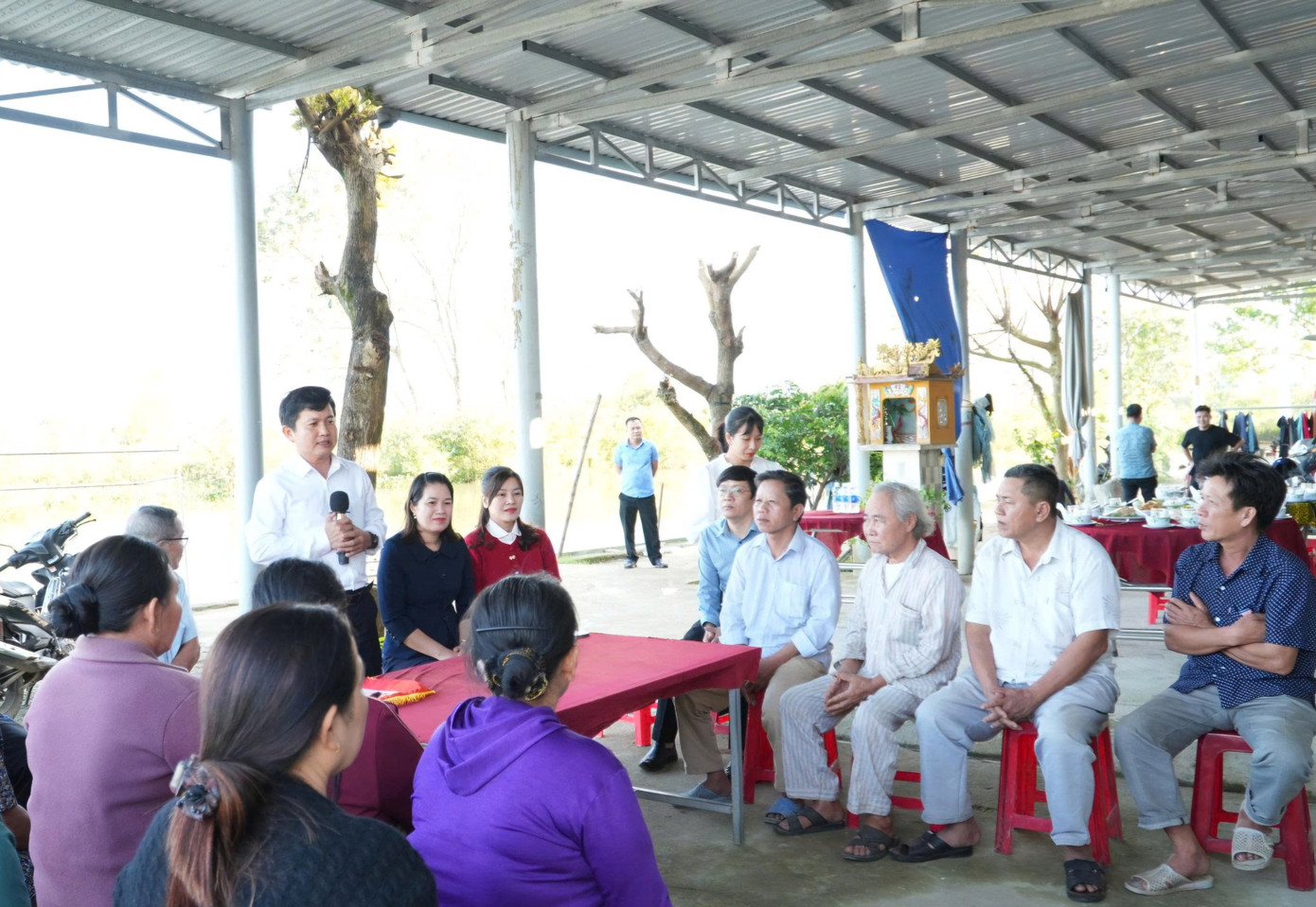 Ông Nguyễn Văn Hiệp - Chủ tịch UBND xã Phú Lộc (người cầm micro), gặp gỡ, chuyện trò, chia sẻ niềm vui cùng người dân trong ngày tổ chức lễ bàn giao "sổ đỏ" cho các hộ gia đình ở Vụng Than.